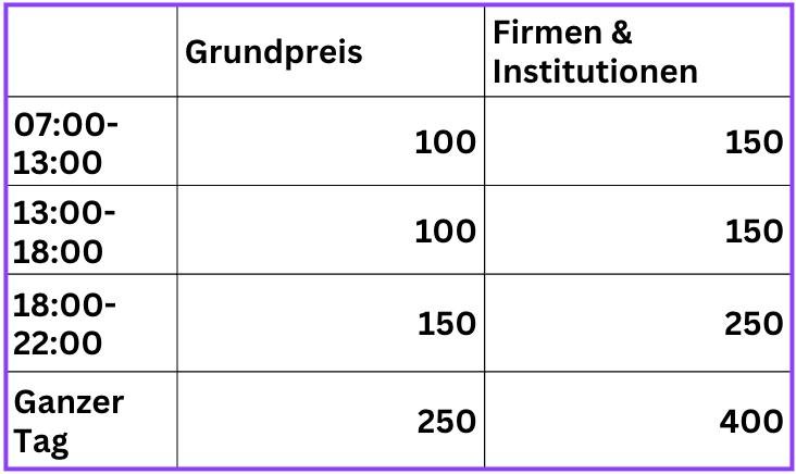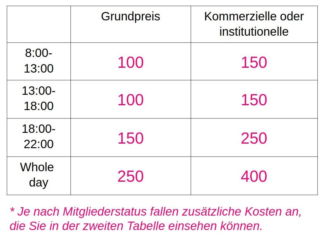 Im Folgenden sind die Grundpreise für die Nutzung der Räumlichkeiten zu verschiedenen Tageszeiten aufgeführt. Für verschiedene Formen der Zusammenarbeit mit dem Verein fallen zusätzliche Gebühren an, je nachdem, ob es sich um Nichtmitglieder, Mitglieder oder Platzhalter handelt (siehe unten).