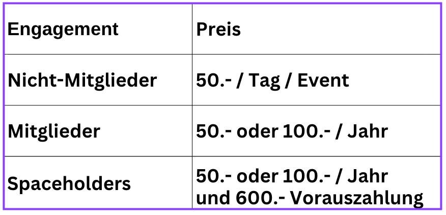 Im Folgenden sind die Grundpreise für die Nutzung der Räumlichkeiten zu verschiedenen Tageszeiten aufgeführt. Für verschiedene Formen der Zusammenarbeit mit dem Verein fallen zusätzliche Gebühren an, je nachdem, ob es sich um Nichtmitglieder, Mitglieder oder Platzhalter handelt (siehe unten).